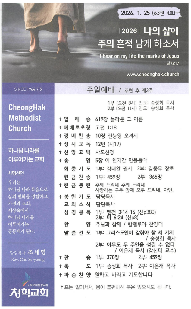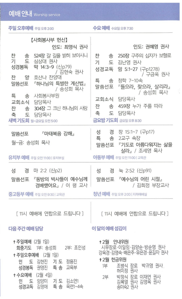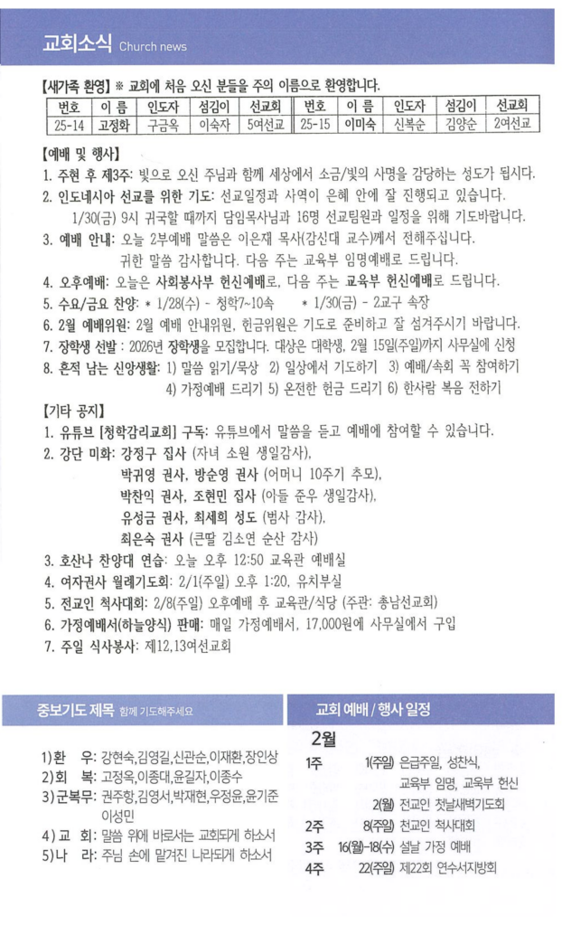 1월242026주보 Category: 주보By 송성회2026년 01월 24일 Author: 송성회 Post navigationPreviousPrevious post:26년 1월 25일 교회소식Related posts26년 1월 18일 주보2026년 01월 17일26년 1월 11일 주보2026년 01월 10일26년 1월 4일 주보2026년 01월 03일25년 12월 28일 주보2025년 12월 27일25년 12월 21일 주보2025년 12월 20일25년 12월 14일 주보2025년 12월 13일