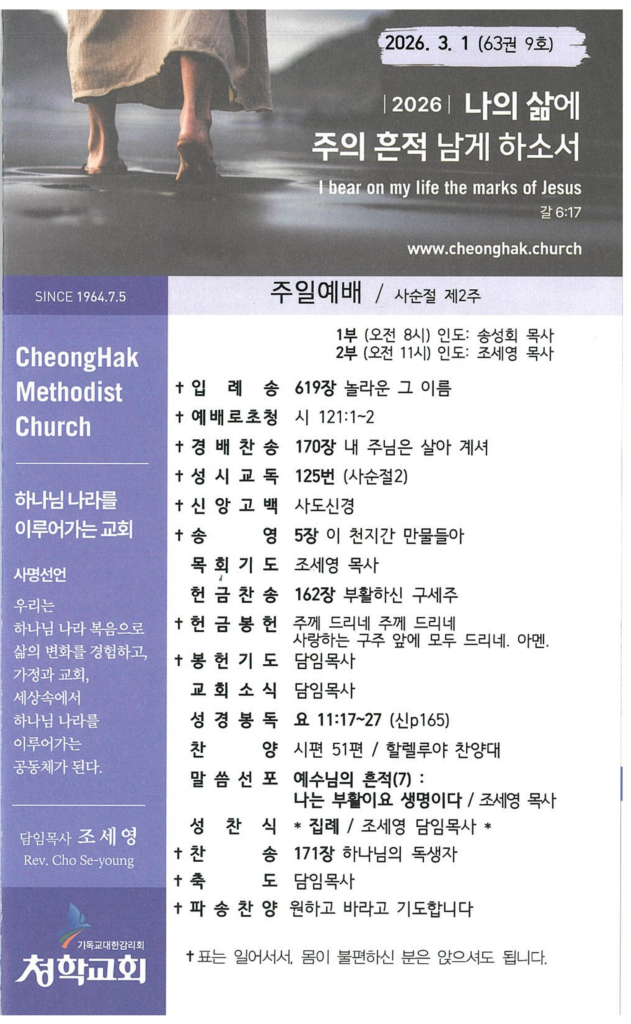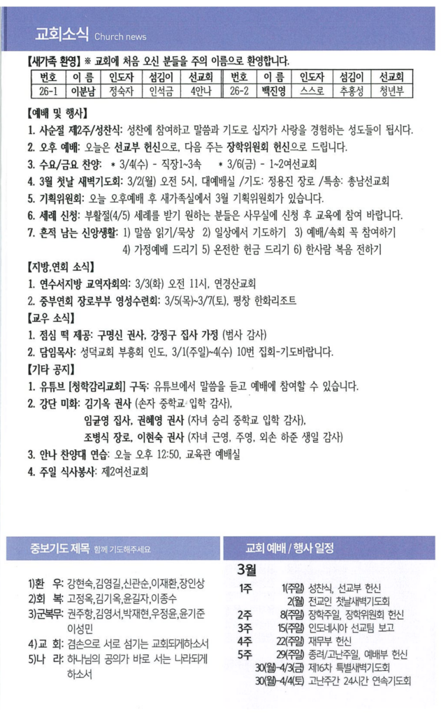 2월282026주보 Category: 주보By 송성회2026년 02월 28일 Author: 송성회 Post navigationPreviousPrevious post:260222 장학금 수여식NextNext post:26년 3월 1일 교회소식Related posts26년 2월 22일 주보2026년 02월 21일26년 2월 15일 주보2026년 02월 14일26년 2월 8일 주보2026년 02월 07일26년 2월 1일 주보2026년 01월 31일26년 1월 25일 주보2026년 01월 24일26년 1월 18일 주보2026년 01월 17일
