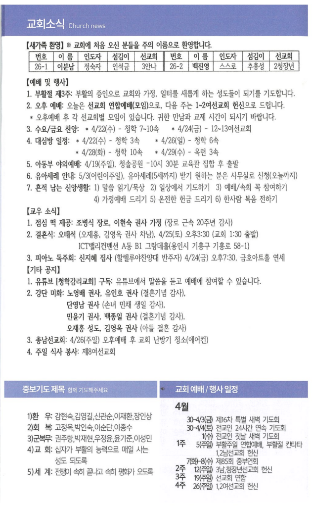 4월182026주보 Category: 주보By 송성회2026년 04월 18일Author: 송성회Post navigationPreviousPrevious post:260412 3남, 청장년 선교회 헌신예배NextNext post:26년 4월 19일 교회소식Related posts26년 4월 12일 주보2026년 04월 11일26년 4월 5일 주보2026년 04월 04일26년 3월 29일 주보2026년 03월 28일26년 3월 22일 주보2026년 03월 21일26년 3월 15일 주보2026년 03월 14일26년 3월 8일 주보2026년 03월 07일